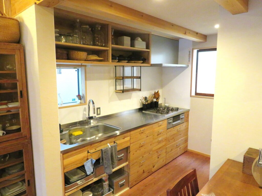 狭小住宅で設置したオリジナルキッチン・見せる収納スタイルです。正直なところ難易度高しです。