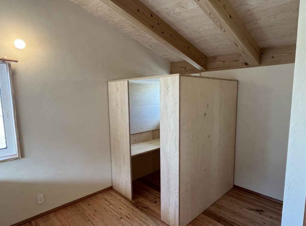 屋根の構造にも使ったヒノキ合板を数枚使い、室内にブースをつくりました。