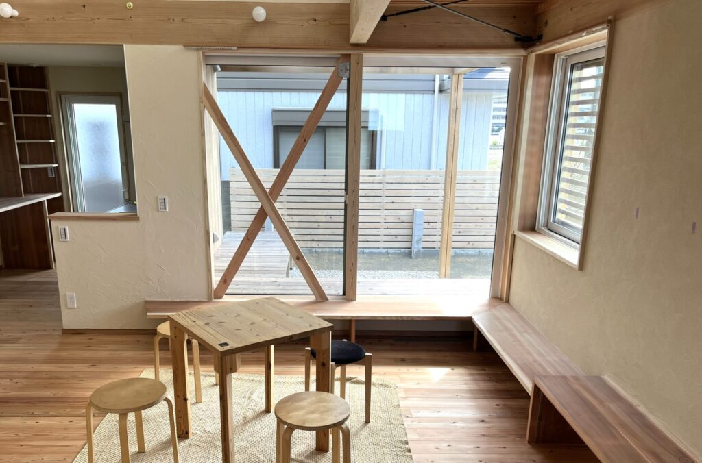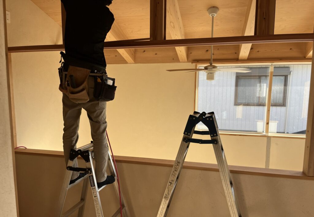 筋交いがちょっとうっとうしいですが、必要なところにはきちっと入れる。これは何よりも優先されるので、仕方がありません。吹き抜けの上に見えるのもブレースといって水平の力を受ける材料です。構造計算結果に則って取り付けています。
