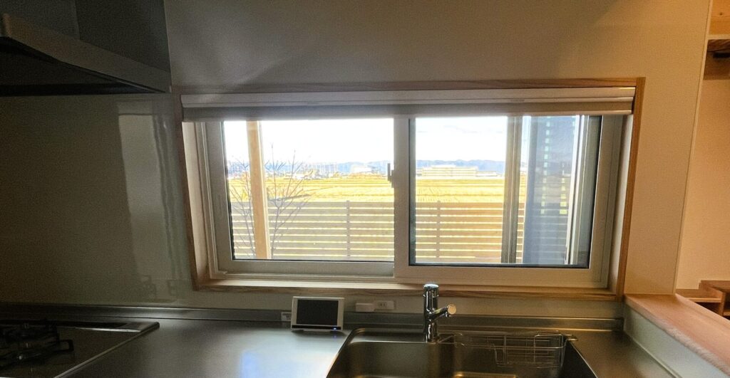キッチンには朝日が入るようにしたい、と普通思うでしょうが、この窓は朝日に照らされた景色が見れるのです。