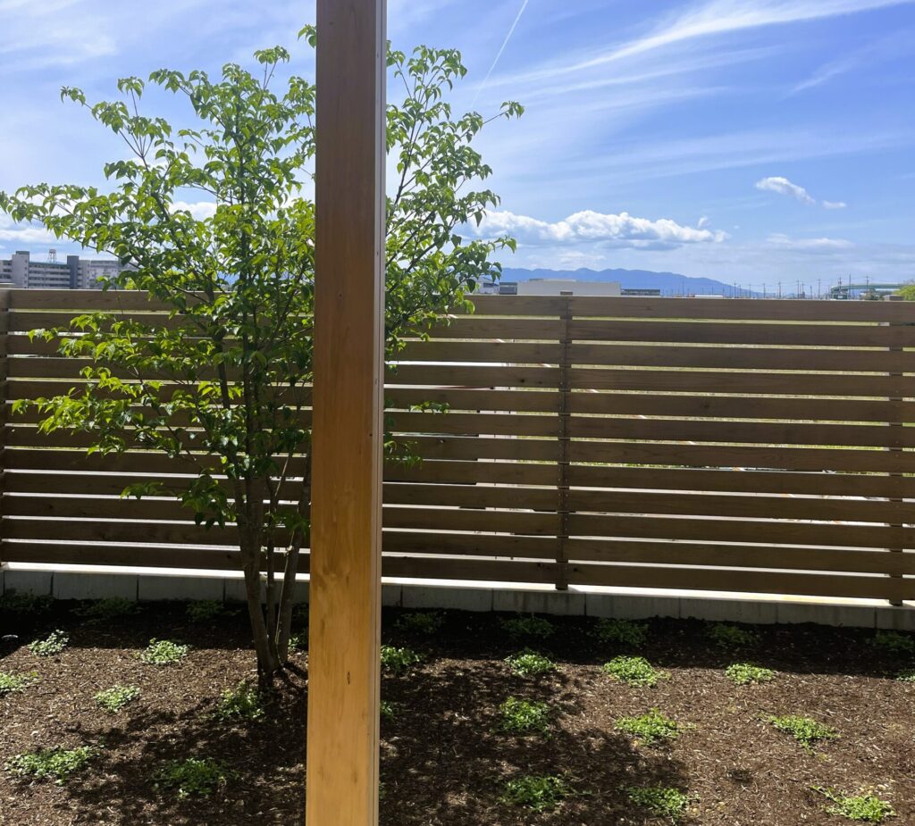 通常、北側は家づくりときあまり力を入れておらず、見たくないものです。特に足元は室外機や給湯器、ガスボンベ、物置、タイヤとかで残念な状態です。そこで「自分で景色をつくる」方法をとります。といっても大げさなことでなく、木フェンスと植栽を配置するだけです。