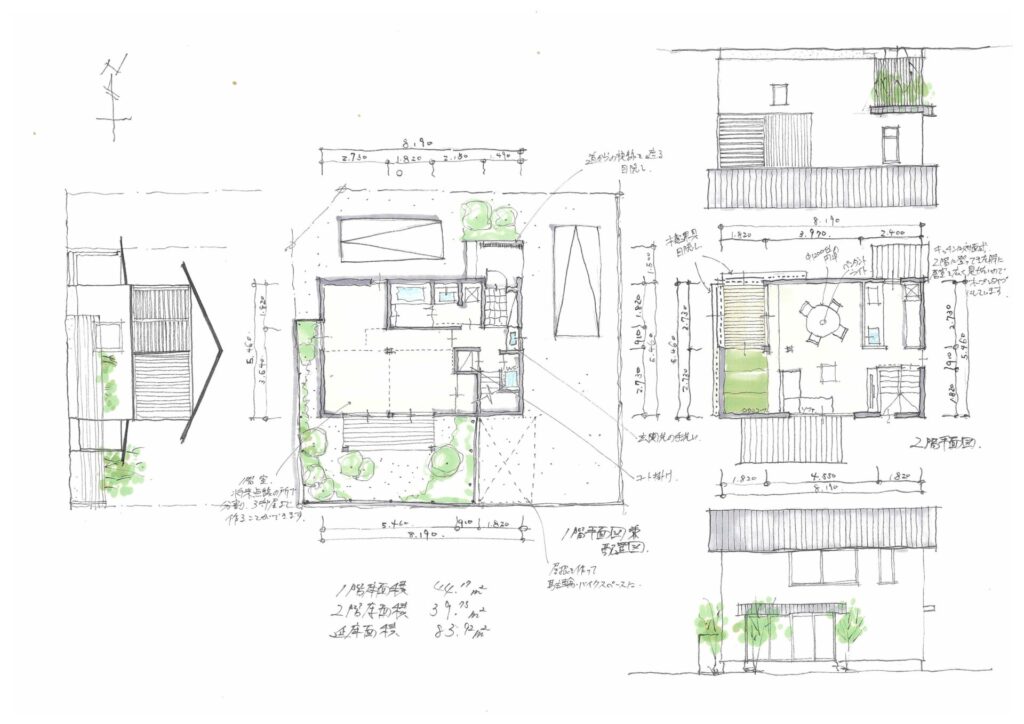 弊社島田がつくった2階リビングのファーストプラン。2階リビングにも外の居場所があります。